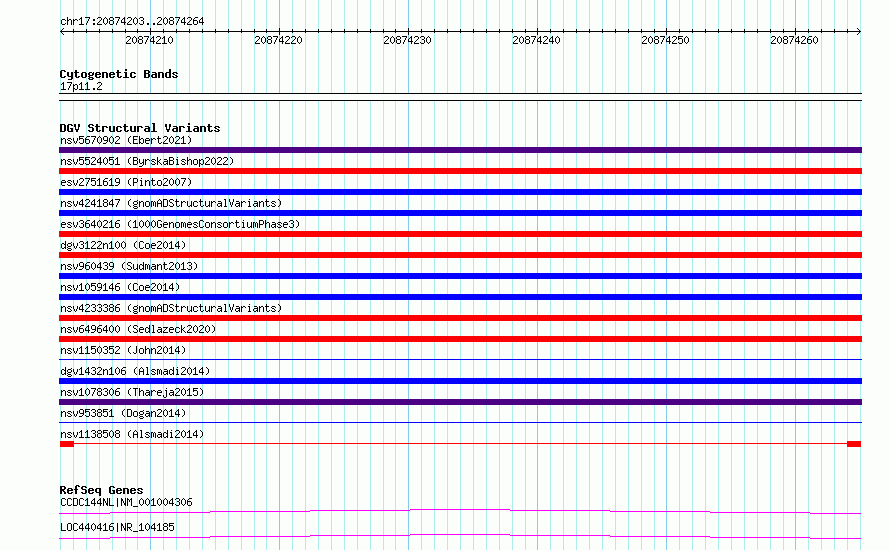 Variant DetailsVariant: nsv1138508| Internal ID | 19249770 | | Landmark | | | Location Information | | | Cytoband | 17p11.2 | | Allele length | | Assembly | Allele length | | hg38 | 62 | | hg19 | 62 |