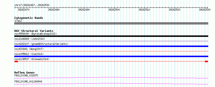 Variant DetailsVariant: nsv1138537| Internal ID | 19263273 | | Landmark | | | Location Information | | | Cytoband | 17q12 | | Allele length | | Assembly | Allele length | | hg38 | 64 | | hg19 | 64 |