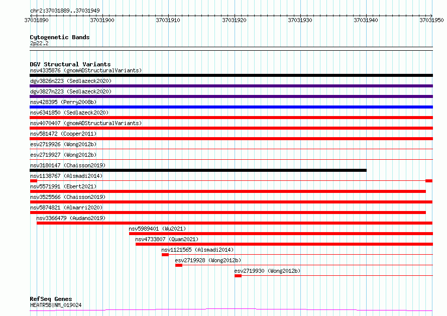 Variant DetailsVariant: nsv1138767| Internal ID | 19259287 | | Landmark | | | Location Information | | | Cytoband | 2p22.2 | | Allele length | | Assembly | Allele length | | hg38 | 61 | | hg19 | 61 |