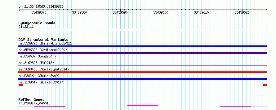 Variant DetailsVariant: nsv1139017| Internal ID | 19258311 | | Landmark | | | Location Information | | | Cytoband | 21q22.11 | | Allele length | | Assembly | Allele length | | hg38 | 61 | | hg19 | 61 |