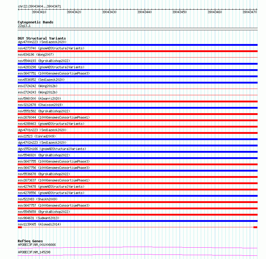 Variant DetailsVariant: nsv1139065| Internal ID | 19262674 | | Landmark | | | Location Information | | | Cytoband | 22q13.1 | | Allele length | | Assembly | Allele length | | hg38 | 68 | | hg19 | 68 |