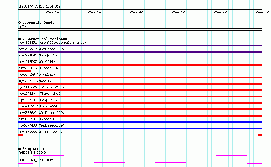 Variant DetailsVariant: nsv1139088| Internal ID | 19274711 | | Landmark | | | Location Information | | | Cytoband | 3p25.3 | | Allele length | | Assembly | Allele length | | hg38 | 58 | | hg19 | 58 |