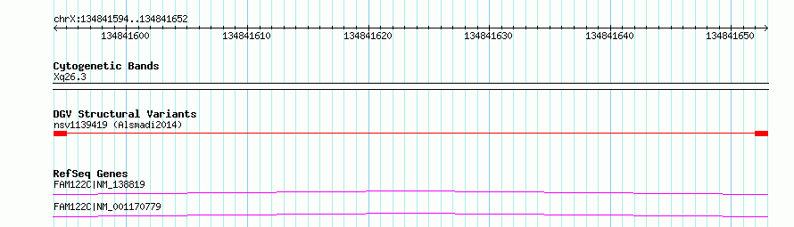 Variant DetailsVariant: nsv1139419| Internal ID | 19280673 | | Landmark | | | Location Information | | | Cytoband | Xq26.3 | | Allele length | | Assembly | Allele length | | hg38 | 59 | | hg19 | 59 |
