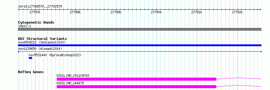 Variant DetailsVariant: nsv1139650| Internal ID | 19283240 | | Landmark | | | Location Information | | | Cytoband | 16p12.1 | | Allele length | | Assembly | Allele length | | hg38 | 6001 | | hg19 | 6001 |