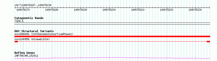 Variant DetailsVariant: nsv1140856| Internal ID | 18924741 | | Landmark | | | Location Information | | | Cytoband | 7q36.1 | | Allele length | | Assembly | Allele length | | hg38 | 68 | | hg19 | 68 |
