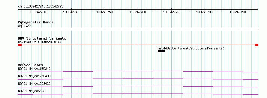 Variant DetailsVariant: nsv1140935| Internal ID | 18904407 | | Landmark | | | Location Information | | | Cytoband | 8q24.22 | | Allele length | | Assembly | Allele length | | hg38 | 72 | | hg19 | 72 |