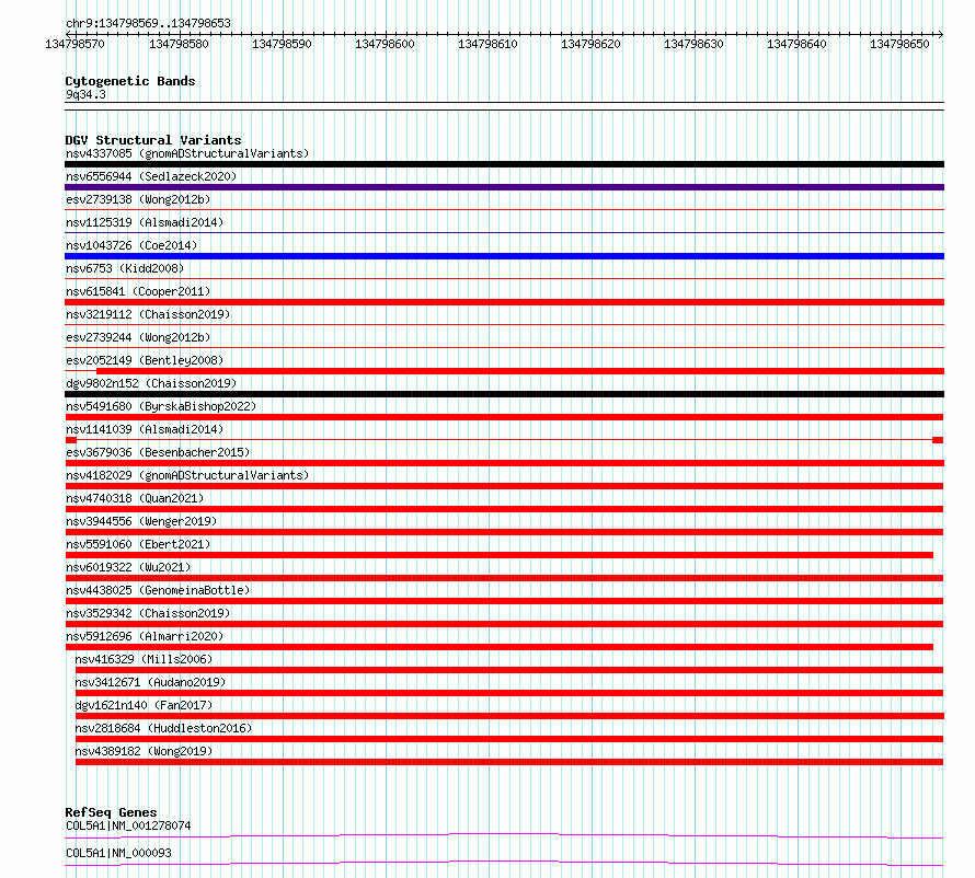 Variant DetailsVariant: nsv1141039| Internal ID | 19280030 | | Landmark | | | Location Information | | | Cytoband | 9q34.3 | | Allele length | | Assembly | Allele length | | hg38 | 85 | | hg19 | 85 |