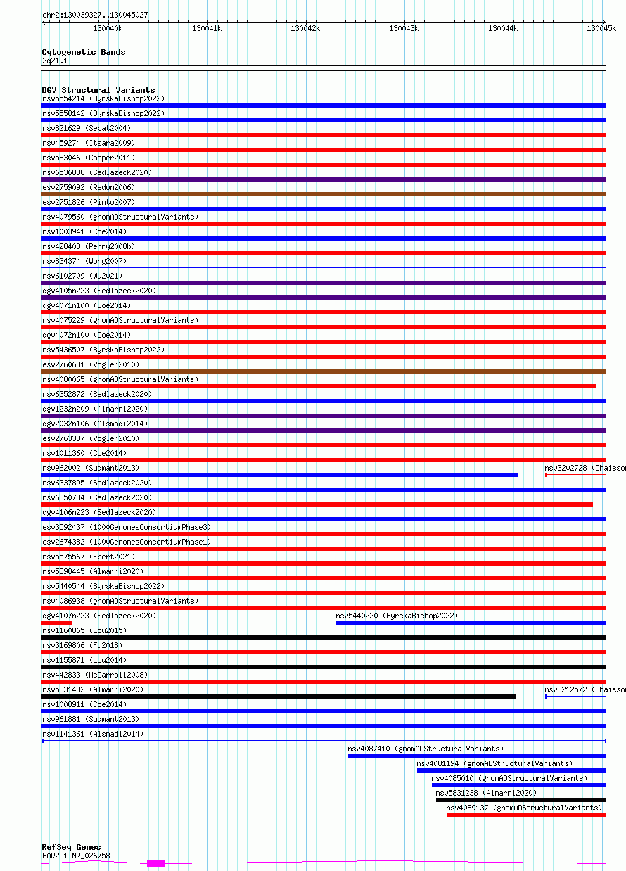 Variant DetailsVariant: nsv1141361| Internal ID | 19283076 | | Landmark | | | Location Information | | | Cytoband | 2q21.1 | | Allele length | | Assembly | Allele length | | hg38 | 5701 | | hg19 | 5701 |