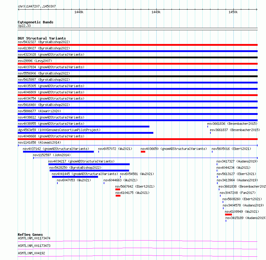 Variant DetailsVariant: nsv1141658| Internal ID | 19257290 | | Landmark | | | Location Information | | | Cytoband | Xp22.33 | | Allele length | | Assembly | Allele length | | hg38 | 3101 | | hg19 | 3101 |