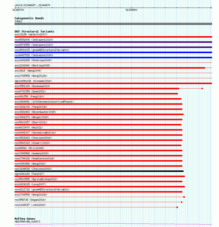 Variant DetailsVariant: nsv1141813| Internal ID | 19264860 | | Landmark | | | Location Information | | | Cytoband | 14q12 | | Allele length | | Assembly | Allele length | | hg38 | 174 | | hg19 | 174 |
