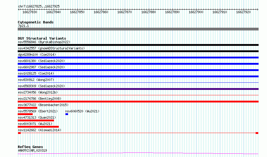 Variant DetailsVariant: nsv1142662| Internal ID | 19263323 | | Landmark | | | Location Information | | | Cytoband | 7p21.1 | | Allele length | | Assembly | Allele length | | hg38 | 101 | | hg19 | 101 |