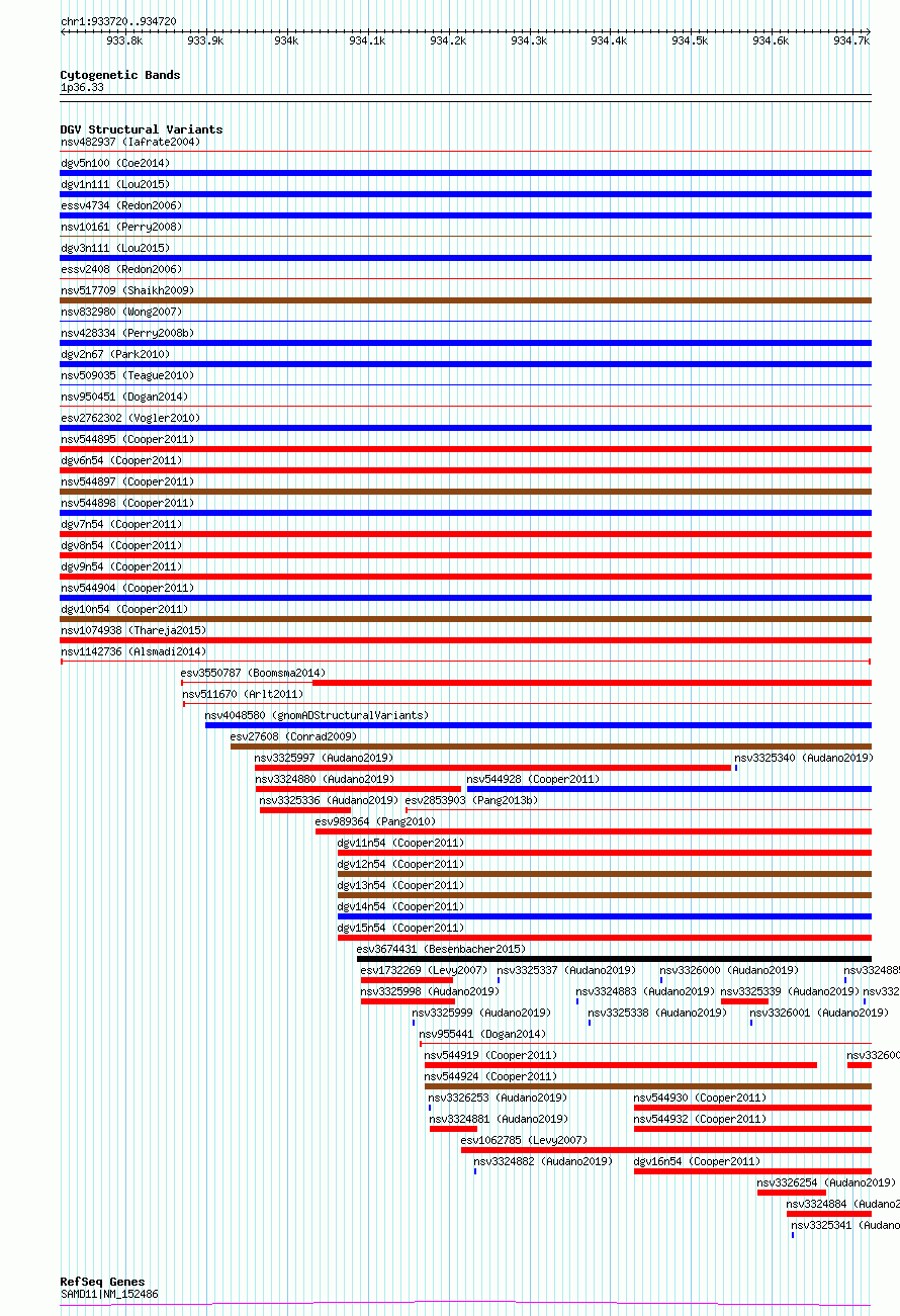 | Variant Type | CNV deletion | Copy Number | | Allele State | | Allele Origin | | Probe Count | | Validation Flag | | Merged Status | M | Merged Variants | | Supporting Variants | nssv3994235 | Samples | KWS1 | Known Genes | SAMD11 | Method | Sequencing | Analysis | HugeSeq | Platform | Illumina HiSeq 2000 | Comments | | Reference | Alsmadi_et_al_2014 | Pubmed ID | 24896259 | Accession Number(s) | nsv1142736