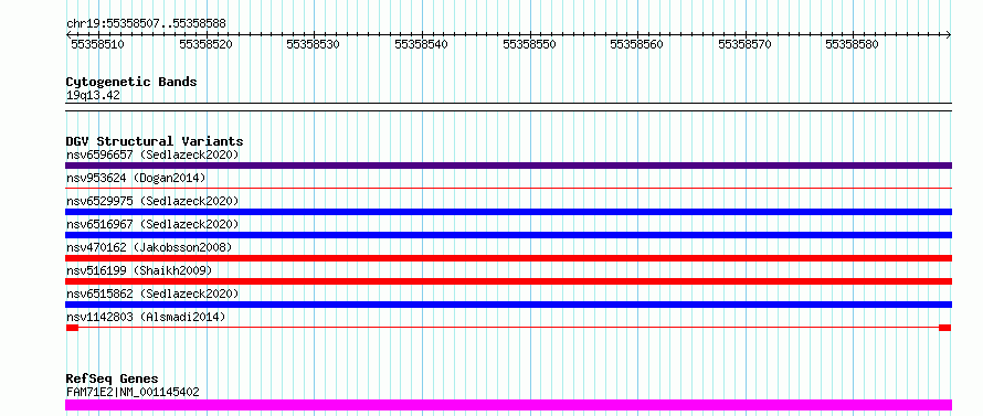 Variant DetailsVariant: nsv1142803| Internal ID | 19266902 | | Landmark | | | Location Information | | | Cytoband | 19q13.42 | | Allele length | | Assembly | Allele length | | hg38 | 82 | | hg19 | 82 |