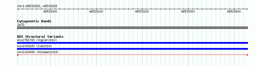 Variant DetailsVariant: nsv1143449| Internal ID | 19274007 | | Landmark | | | Location Information | | | Cytoband | 1p33 | | Allele length | | Assembly | Allele length | | hg38 | 501 | | hg19 | 501 |