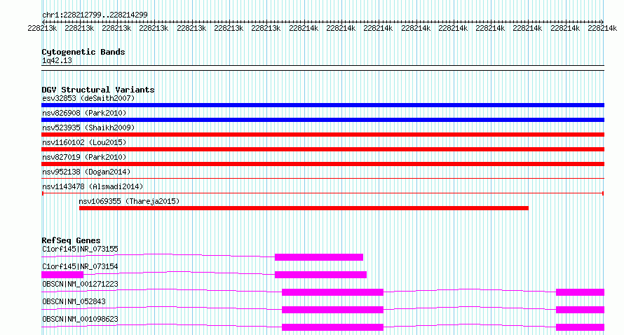 | | Variant Type | CNV deletion | | Copy Number | | | Allele State | | | Allele Origin | | | Probe Count | | | Validation Flag | | | Merged Status | M | | Merged Variants | | | Supporting Variants | nssv3980682 | | Samples | KWS1 | | Known Genes | C1orf145, OBSCN | | Method | Sequencing | | Analysis | HugeSeq | | Platform | Illumina HiSeq 2000 | | Comments | | | Reference | Alsmadi_et_al_2014 | | Pubmed ID | 24896259 | | Accession Number(s) | nsv1143478