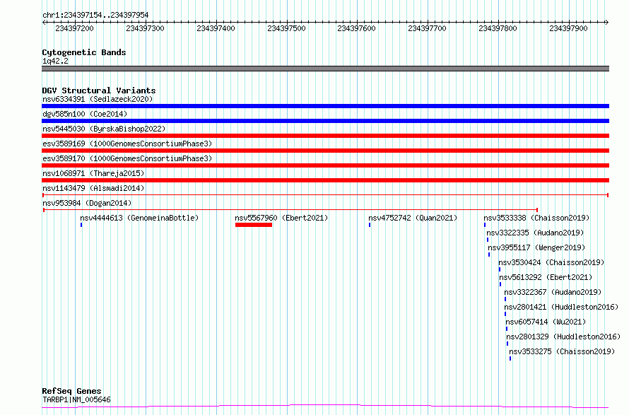 Variant DetailsVariant: nsv1143479| Internal ID | 19260349 | | Landmark | | | Location Information | | | Cytoband | 1q42.2 | | Allele length | | Assembly | Allele length | | hg38 | 801 | | hg19 | 801 |