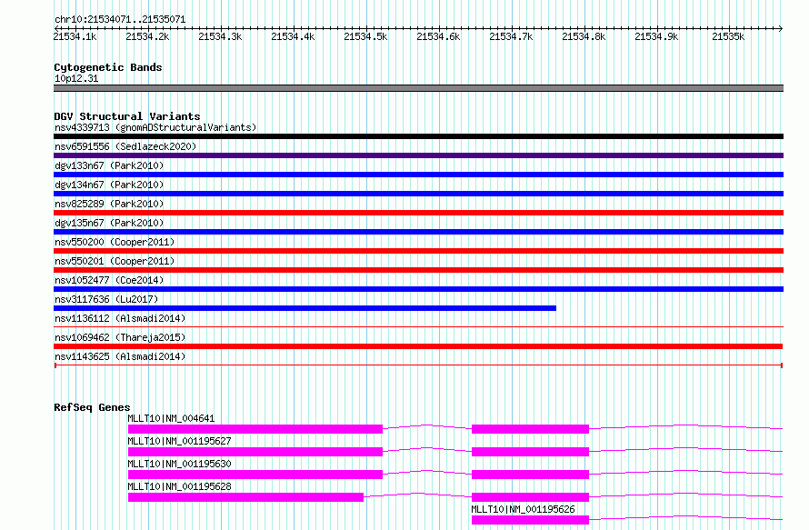 Variant DetailsVariant: nsv1143625| Internal ID | 19283957 | | Landmark | | | Location Information | | | Cytoband | 10p12.31 | | Allele length | | Assembly | Allele length | | hg38 | 1001 | | hg19 | 1001 |