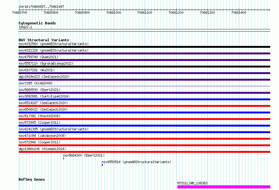 Variant DetailsVariant: nsv1143826| Internal ID | 19252109 | | Landmark | | | Location Information | | | Cytoband | 16q22.1 | | Allele length | | Assembly | Allele length | | hg38 | 801 | | hg19 | 801 |