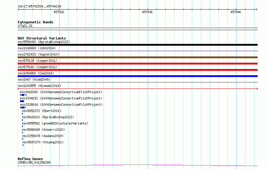 Variant DetailsVariant: nsv1143855| Internal ID | 19275128 | | Landmark | | | Location Information | | | Cytoband | 17q21.31 | | Allele length | | Assembly | Allele length | | hg38 | 2701 | | hg19 | 2701 |