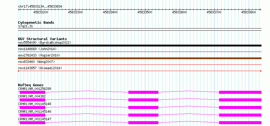 Variant DetailsVariant: nsv1143857| Internal ID | 19264978 | | Landmark | | | Location Information | | | Cytoband | 17q21.31 | | Allele length | | Assembly | Allele length | | hg38 | 701 | | hg19 | 701 |