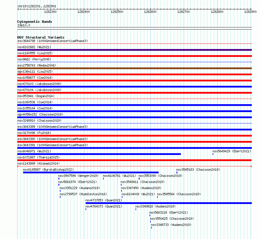 Variant DetailsVariant: nsv1143899| Internal ID | 19249220 | | Landmark | | | Location Information | | | Cytoband | 19p13.3 | | Allele length | | Assembly | Allele length | | hg38 | 701 | | hg19 | 701 |