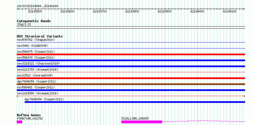 Variant DetailsVariant: nsv1143990| Internal ID | 19258992 | | Landmark | | | Location Information | | | Cytoband | 20q13.33 | | Allele length | | Assembly | Allele length | | hg38 | 701 | | hg19 | 701 |