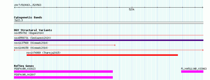 | | Variant Type | CNV deletion | | Copy Number | | | Allele State | | | Allele Origin | | | Probe Count | | | Validation Flag | | | Merged Status | M | | Merged Variants | | | Supporting Variants | nssv3994883 | | Samples | KWS1 | | Known Genes | FLJ44511, PDGFA | | Method | Sequencing | | Analysis | HugeSeq | | Platform | Illumina HiSeq 2000 | | Comments | | | Reference | Alsmadi_et_al_2014 | | Pubmed ID | 24896259 | | Accession Number(s) | nsv1144158