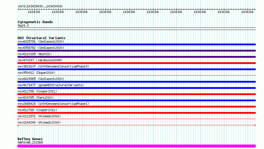 | | Variant Type | CNV deletion | | Copy Number | | | Allele State | | | Allele Origin | | | Probe Count | | | Validation Flag | | | Merged Status | M | | Merged Variants | | | Supporting Variants | nssv3994972 | | Samples | KWS1 | | Known Genes | MAFA | | Method | Sequencing | | Analysis | HugeSeq | | Platform | Illumina HiSeq 2000 | | Comments | | | Reference | Alsmadi_et_al_2014 | | Pubmed ID | 24896259 | | Accession Number(s) | nsv1144240
