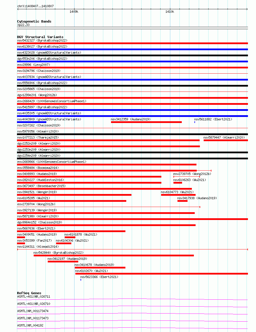 Variant DetailsVariant: nsv1144311| Internal ID | 19252519 | | Landmark | | | Location Information | | | Cytoband | Xp22.33 | | Allele length | | Assembly | Allele length | | hg38 | 2401 | | hg19 | 2401 |