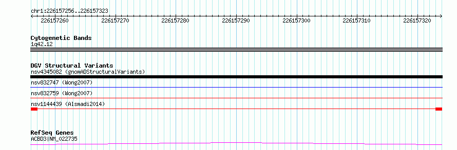 Variant DetailsVariant: nsv1144439| Internal ID | 19259440 | | Landmark | | | Location Information | | | Cytoband | 1q42.12 | | Allele length | | Assembly | Allele length | | hg38 | 68 | | hg19 | 68 |