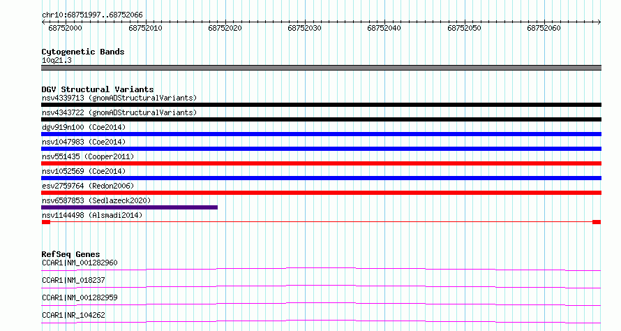 Variant DetailsVariant: nsv1144498| Internal ID | 19274287 | | Landmark | | | Location Information | | | Cytoband | 10q21.3 | | Allele length | | Assembly | Allele length | | hg38 | 70 | | hg19 | 70 |