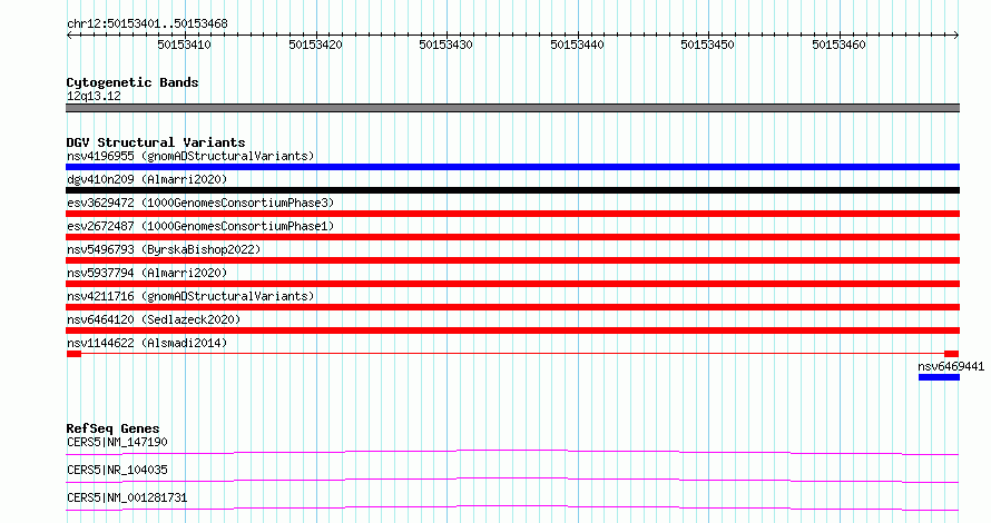 Variant DetailsVariant: nsv1144622| Internal ID | 19261448 | | Landmark | | | Location Information | | | Cytoband | 12q13.12 | | Allele length | | Assembly | Allele length | | hg38 | 68 | | hg19 | 68 |