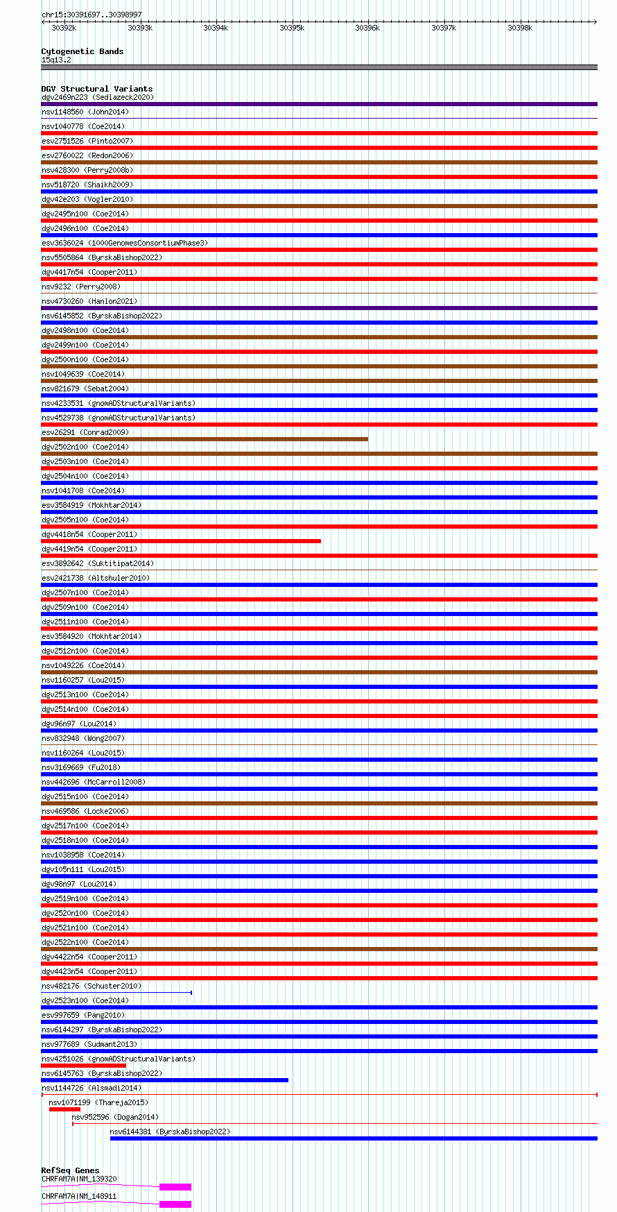 Variant DetailsVariant: nsv1144726| Internal ID | 19278005 | | Landmark | | | Location Information | | | Cytoband | 15q13.2 | | Allele length | | Assembly | Allele length | | hg38 | 7301 | | hg19 | 7301 |