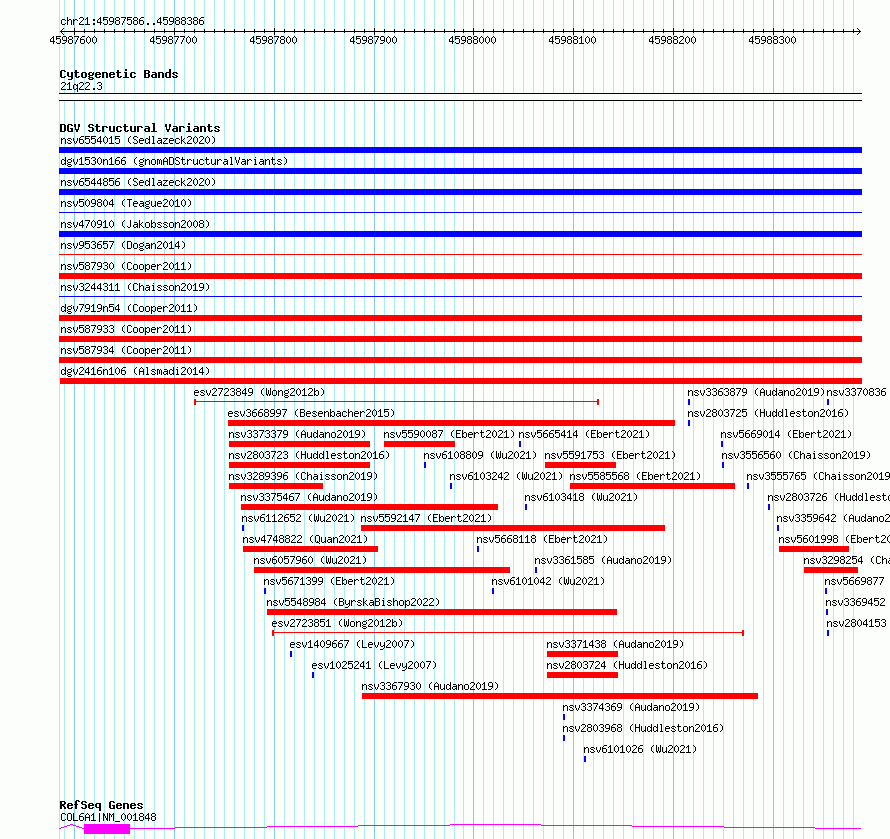 Variant DetailsVariant: nsv1144957| Internal ID | 19263377 | | Landmark | | | Location Information | | | Cytoband | 21q22.3 | | Allele length | | Assembly | Allele length | | hg38 | 801 | | hg19 | 801 |