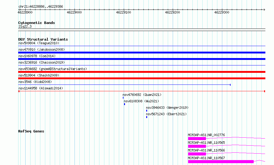 Variant DetailsVariant: nsv1144958| Internal ID | 19248123 | | Landmark | | | Location Information | | | Cytoband | 21q22.3 | | Allele length | | Assembly | Allele length | | hg38 | 501 | | hg19 | 501 |