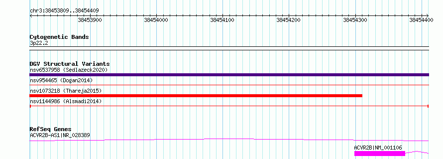 Variant DetailsVariant: nsv1144986| Internal ID | 19256442 | | Landmark | | | Location Information | | | Cytoband | 3p22.2 | | Allele length | | Assembly | Allele length | | hg38 | 601 | | hg19 | 601 |
