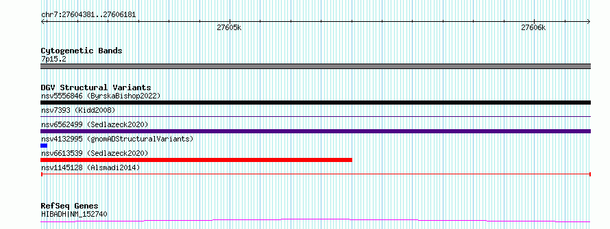 Variant DetailsVariant: nsv1145128| Internal ID | 19260740 | | Landmark | | | Location Information | | | Cytoband | 7p15.2 | | Allele length | | Assembly | Allele length | | hg38 | 1801 | | hg19 | 1801 |