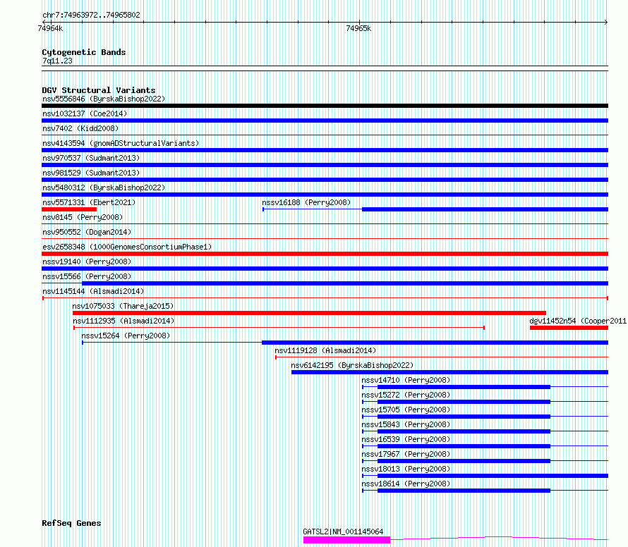 Variant DetailsVariant: nsv1145144| Internal ID | 19263935 | | Landmark | | | Location Information | | | Cytoband | 7q11.23 | | Allele length | | Assembly | Allele length | | hg38 | 1831 | | hg19 | 1201 |