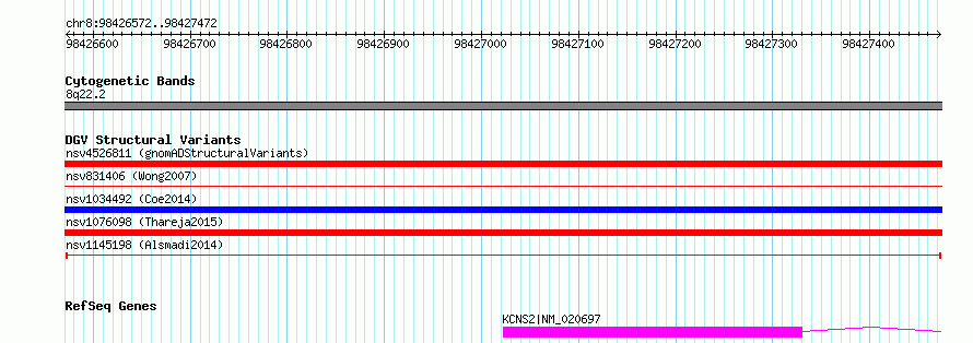 | | Variant Type | CNV deletion | | Copy Number | | | Allele State | | | Allele Origin | | | Probe Count | | | Validation Flag | | | Merged Status | M | | Merged Variants | | | Supporting Variants | nssv3982283 | | Samples | KWS1 | | Known Genes | KCNS2 | | Method | Sequencing | | Analysis | HugeSeq | | Platform | Illumina HiSeq 2000 | | Comments | | | Reference | Alsmadi_et_al_2014 | | Pubmed ID | 24896259 | | Accession Number(s) | nsv1145198