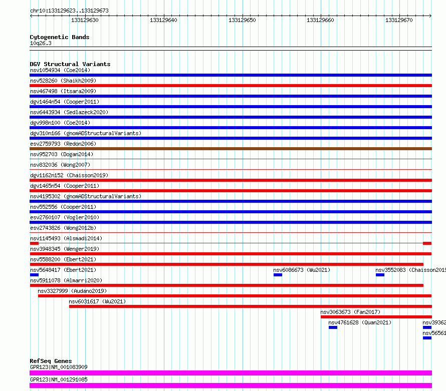 Variant DetailsVariant: nsv1145493| Internal ID | 19273773 | | Landmark | | | Location Information | | | Cytoband | 10q26.3 | | Allele length | | Assembly | Allele length | | hg38 | 51 | | hg19 | 51 |