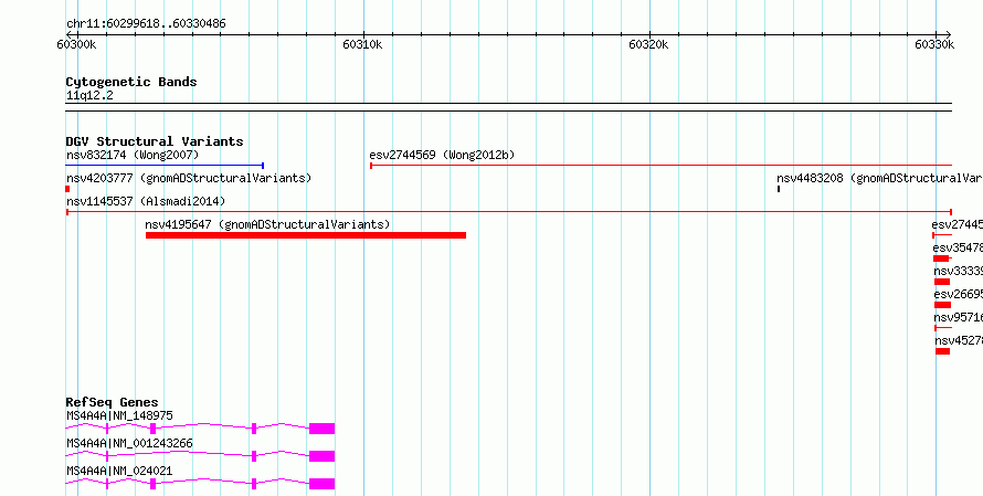 | | Variant Type | CNV deletion | | Copy Number | | | Allele State | | | Allele Origin | | | Probe Count | | | Validation Flag | | | Merged Status | M | | Merged Variants | | | Supporting Variants | nssv3983176 | | Samples | KWS1 | | Known Genes | MIR6503, MS4A4A | | Method | Sequencing | | Analysis | HugeSeq | | Platform | Illumina HiSeq 2000 | | Comments | | | Reference | Alsmadi_et_al_2014 | | Pubmed ID | 24896259 | | Accession Number(s) | nsv1145537