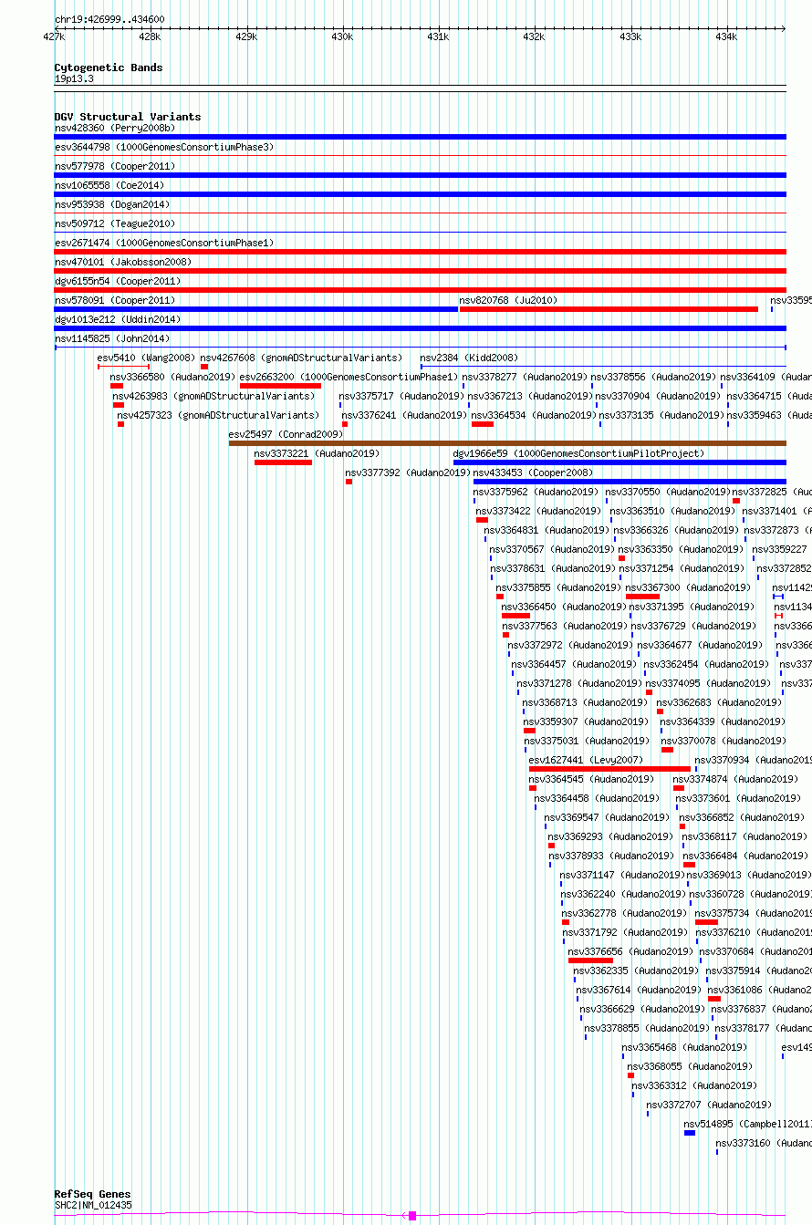 | Variant Type | CNV duplication | Copy Number | | Allele State | | Allele Origin | | Probe Count | | Validation Flag | | Merged Status | M | Merged Variants | | Supporting Variants | nssv3997185 | Samples | KWB1 | Known Genes | SHC2 | Method | Sequencing | Analysis | HugeSeq | Platform | Illumina HiSeq 2000 | Comments | | Reference | John_et_al_2014 | Pubmed ID | 26484159 | Accession Number(s) | nsv1145825