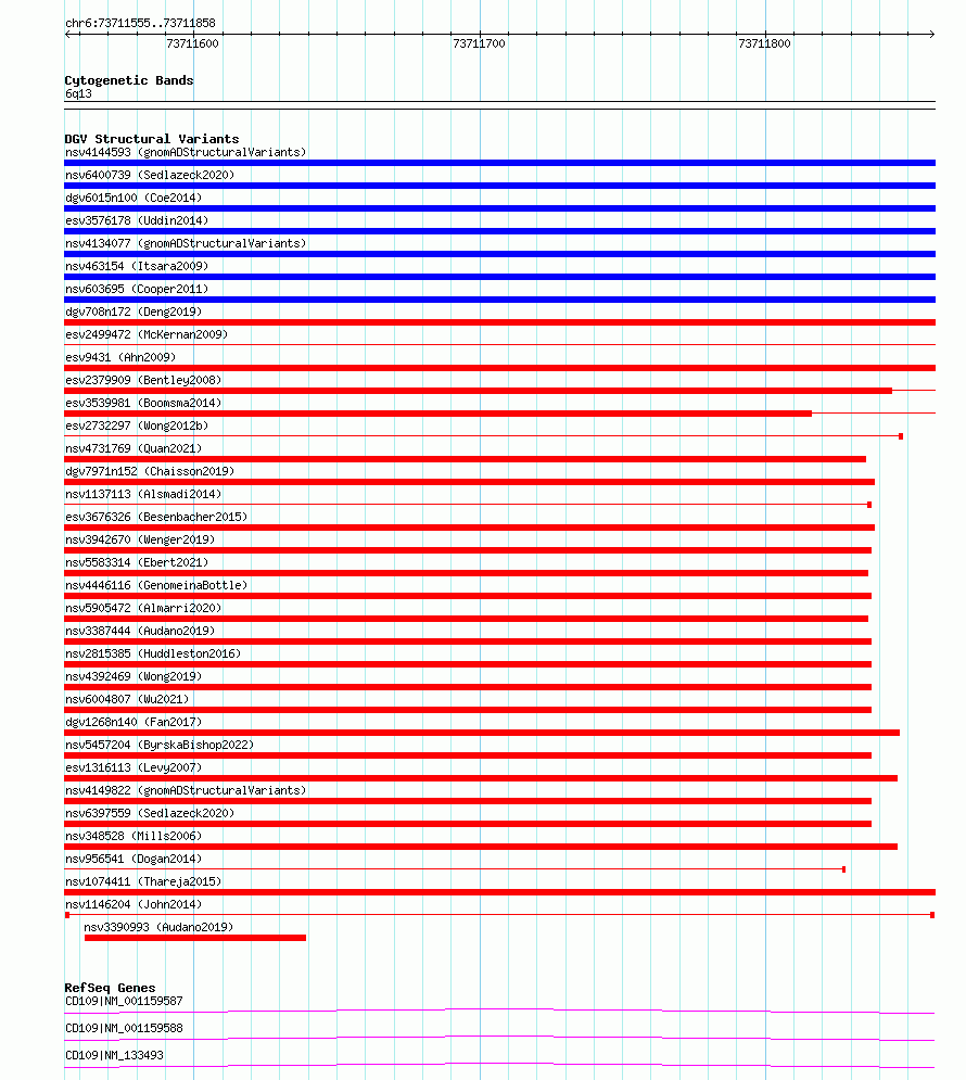 Variant DetailsVariant: nsv1146204| Internal ID | 19199847 | | Landmark | | | Location Information | | | Cytoband | 6q13 | | Allele length | | Assembly | Allele length | | hg38 | 304 | | hg19 | 304 |
