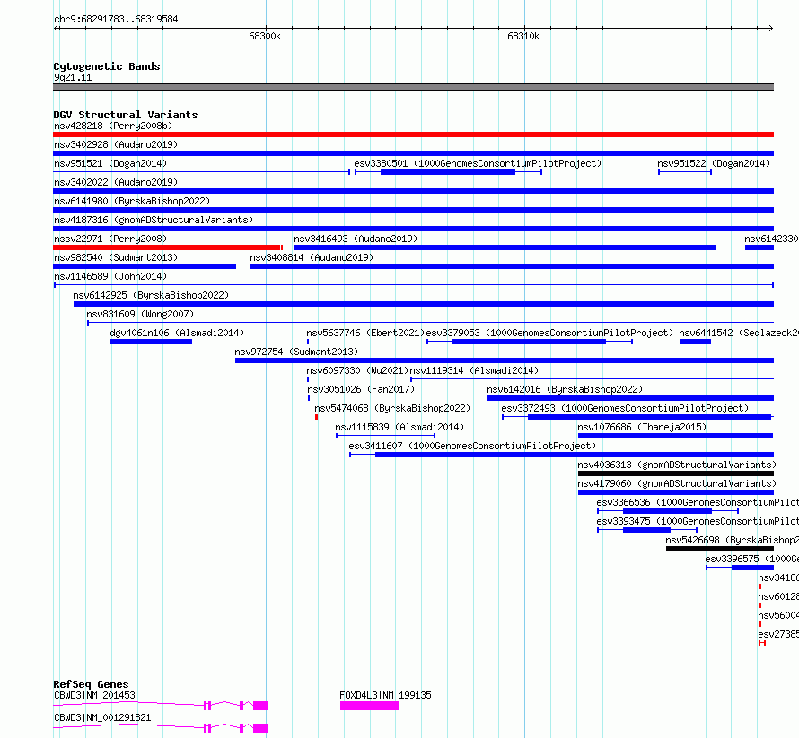 Variant DetailsVariant: nsv1146589| Internal ID | 19198246 | | Landmark | | | Location Information | | | Cytoband | 9q21.11 | | Allele length | | Assembly | Allele length | | hg38 | 27802 | | hg19 | 27802 |
