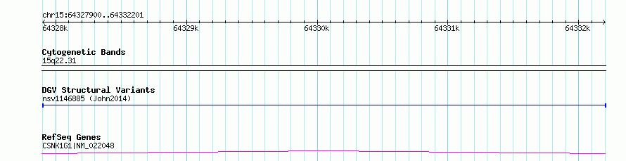 | | Variant Type | CNV duplication | | Copy Number | | | Allele State | | | Allele Origin | | | Probe Count | | | Validation Flag | | | Merged Status | M | | Merged Variants | | | Supporting Variants | nssv3998250 | | Samples | KWB1 | | Known Genes | CSNK1G1 | | Method | Sequencing | | Analysis | HugeSeq | | Platform | Illumina HiSeq 2000 | | Comments | | | Reference | John_et_al_2014 | | Pubmed ID | 26484159 | | Accession Number(s) | nsv1146885