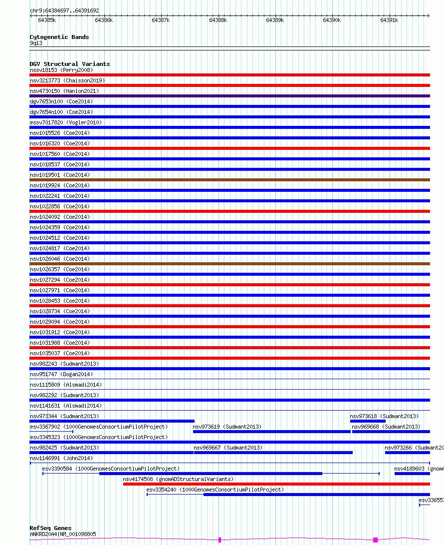 Variant DetailsVariant: nsv1146991| Internal ID | 19200938 | | Landmark | | | Location Information | | | Cytoband | 9p12 | | Allele length | | Assembly | Allele length | | hg38 | 6996 | | hg19 | 7002 |