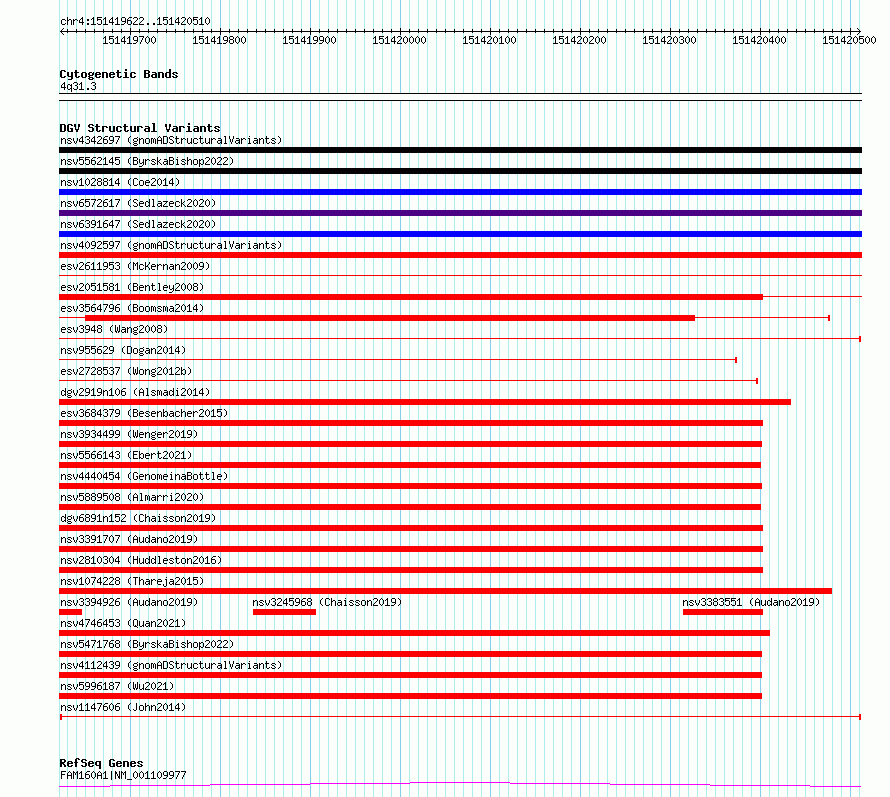 Variant DetailsVariant: nsv1147606| Internal ID | 19197323 | | Landmark | | | Location Information | | | Cytoband | 4q31.3 | | Allele length | | Assembly | Allele length | | hg38 | 889 | | hg19 | 889 |