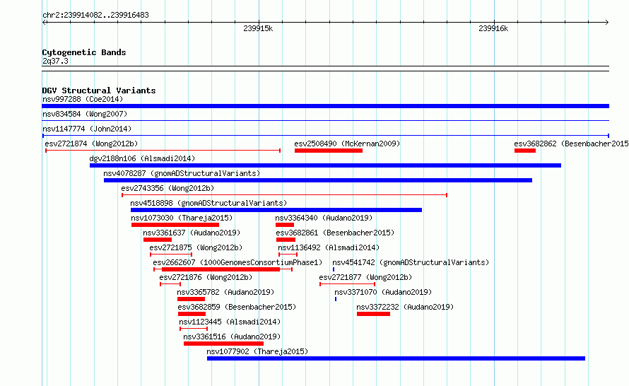 Variant DetailsVariant: nsv1147774| Internal ID | 18850389 | | Landmark | | | Location Information | | | Cytoband | 2q37.3 | | Allele length | | Assembly | Allele length | | hg38 | 2402 | | hg19 | 2402 |