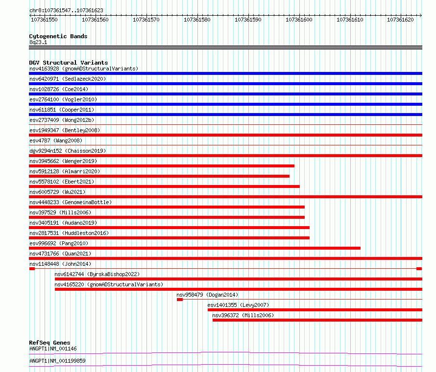 Variant DetailsVariant: nsv1148448| Internal ID | 19196896 | | Landmark | | | Location Information | | | Cytoband | 8q23.1 | | Allele length | | Assembly | Allele length | | hg38 | 77 | | hg19 | 77 |