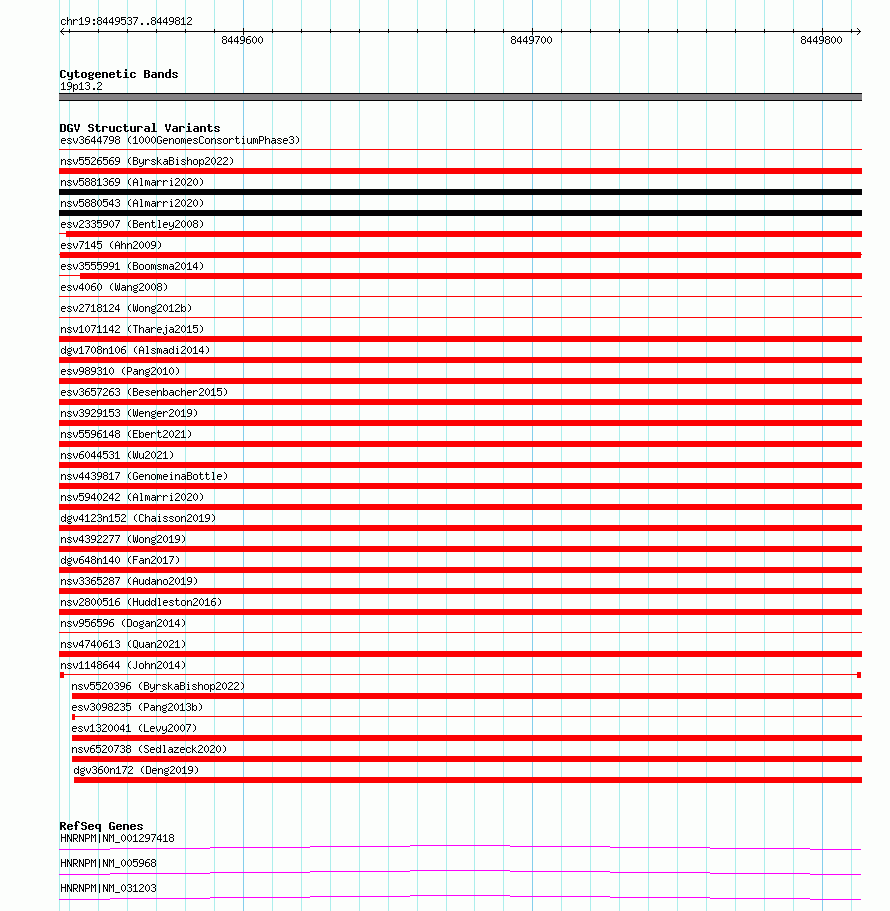 Variant DetailsVariant: nsv1148644| Internal ID | 19195644 | | Landmark | | | Location Information | | | Cytoband | 19p13.2 | | Allele length | | Assembly | Allele length | | hg38 | 276 | | hg19 | 276 |